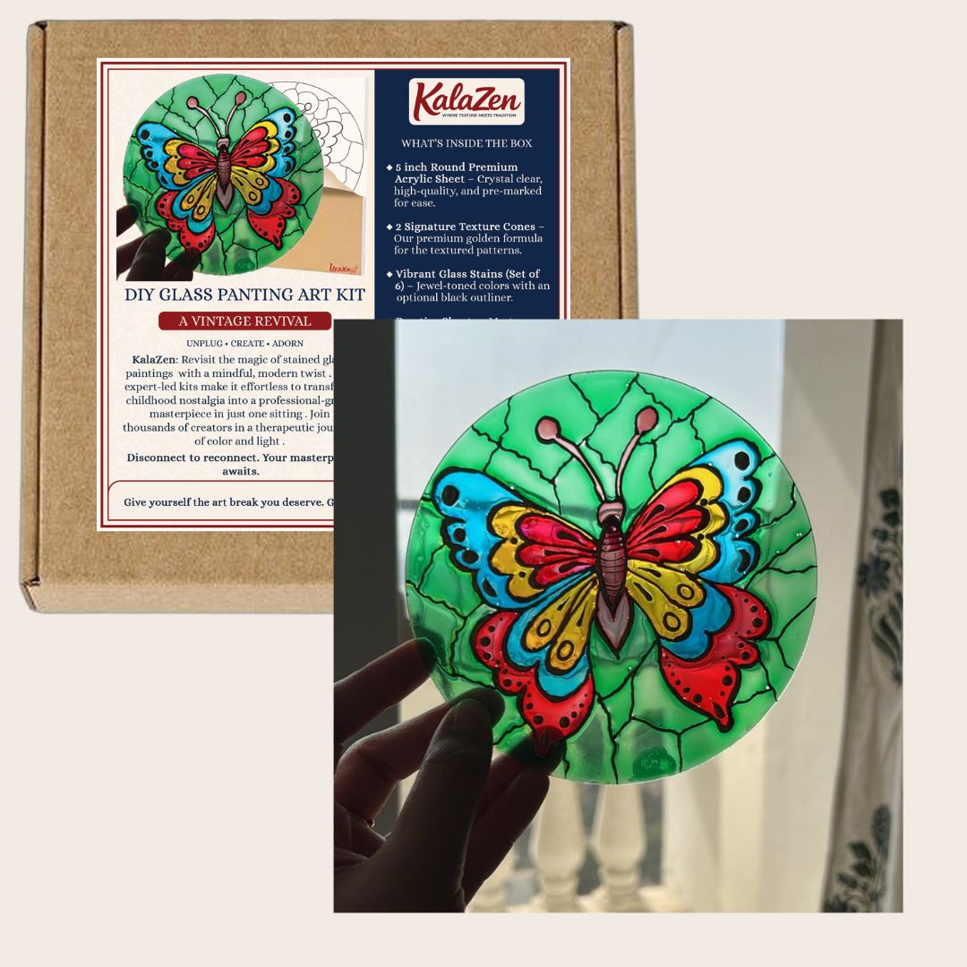 Butterflies and glass painting are a natural match — and the gold cone outlines in this kit make the wings shimmer at their best. The compact 6×6 inch glass painting kit is one of our most gift-friendly DIY art kits. Vibrant, detailed, and deeply satisfying to create.
